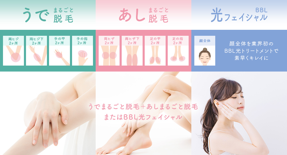 顔・首、手・腕、胸・お腹、ワキ、足・指、太ももなど各部位を脱毛できます。